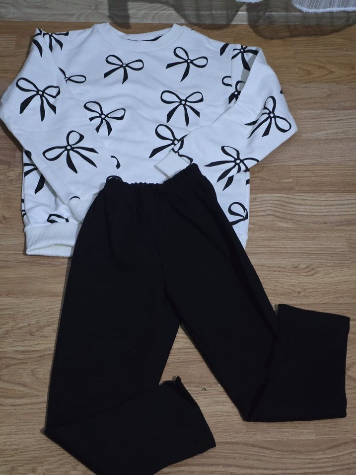 Kız çocuklar için beyaz üzerine siyah fiyonk baskılı, uzun kollu ve yuvarlak yaka sweatshirt ile siyah tayt ikili takımı. Yumuşak ve sıcak kumaştan üretilmiştir. 2-3yastan 8-9yaslara kadar mevcutur bedenler