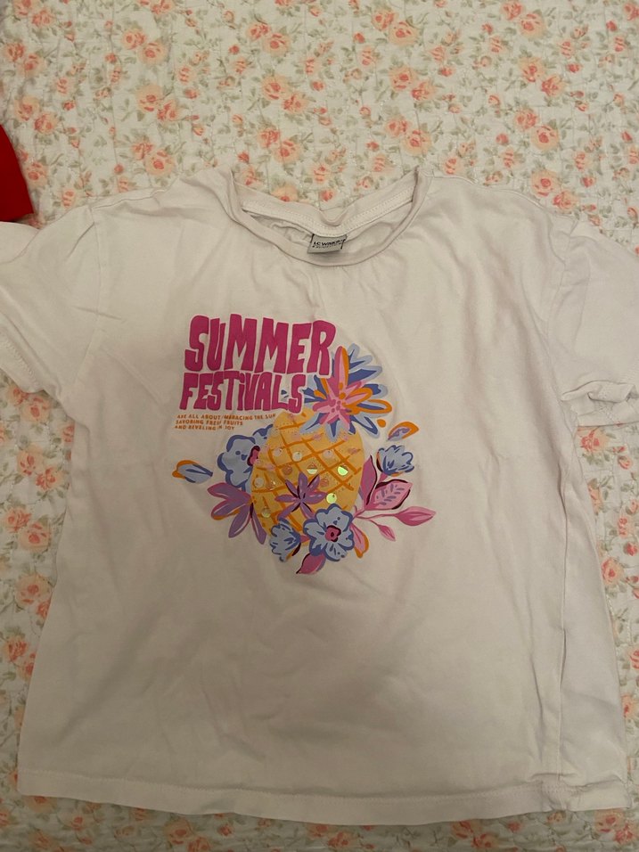 Beyaz, kısa kollu, yuvarlak yaka, bol kesim kız çocuk tişörtü, renkli yaz festivali baskılı ve yumuşak kumaştan yapılmıştır.