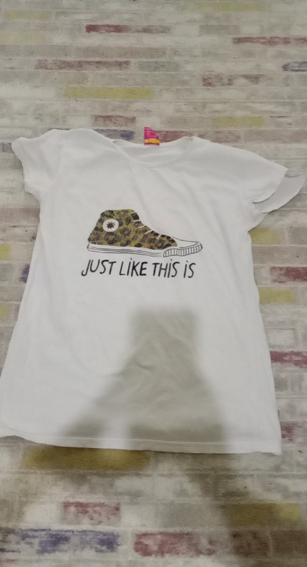 Kısa kollu, yuvarlak yaka, beyaz kız çocuk tişörtü, "JUST LIKE THIS iS" yazısı bulunur. temiz sağlam ürün