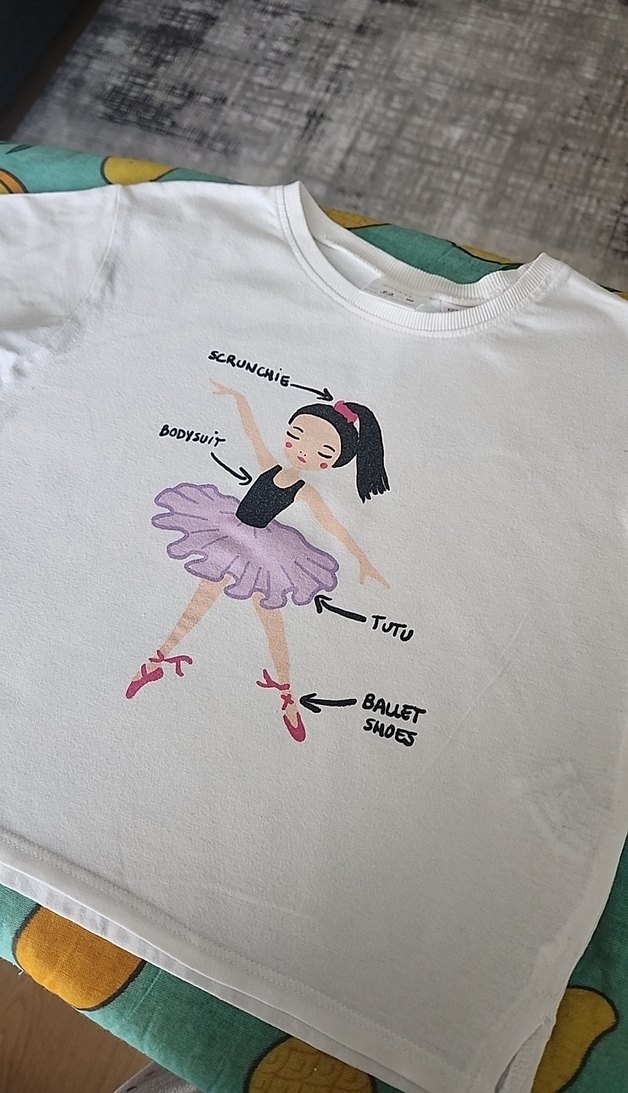 Beyaz pamuklu, kısa kollu, yuvarlak yakalı kız çocuk tişörtü. Pastel renkli baskılı bale figürü ve fırfır detaylı, rahat kesim.
