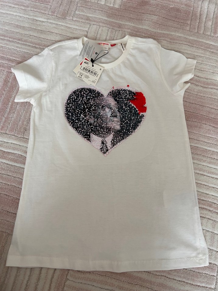 Pamuklu, kısa kollu, bisiklet yaka, baskılı kalp deseni olan beyaz ve gri tonlarda kız çocuk tişörtü. ❤️