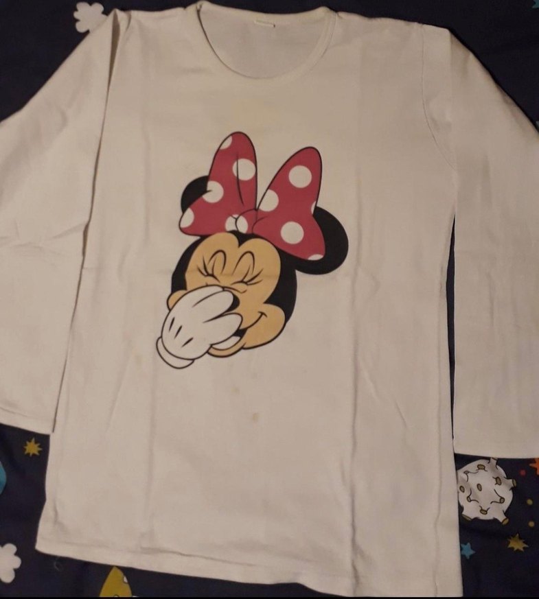 Pamuklu, beyaz, uzun kollu, fitted kesim kız çocuk tişörtü, baskılı Minnie Mouse deseni ve yuvarlak yaka detayına sahiptir. kullanilmiş son fotoda gösterdim 1-2 leke var baska bi kusuru yok