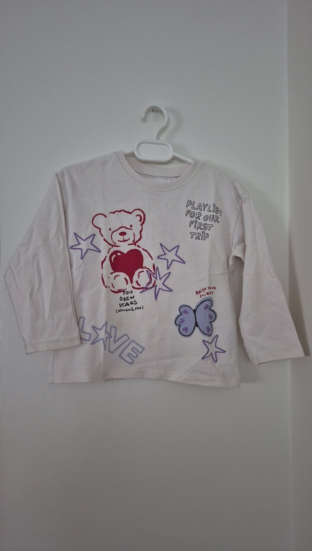 Beyaz renkli, uzun kollu kız çocuk tişörtü, bol kesim ve yumuşak dokulu kumaşa sahiptir. Ayıcık, yıldız ve kelebek baskıları pastel tonlarda ve yuvarlak yakalıdır.