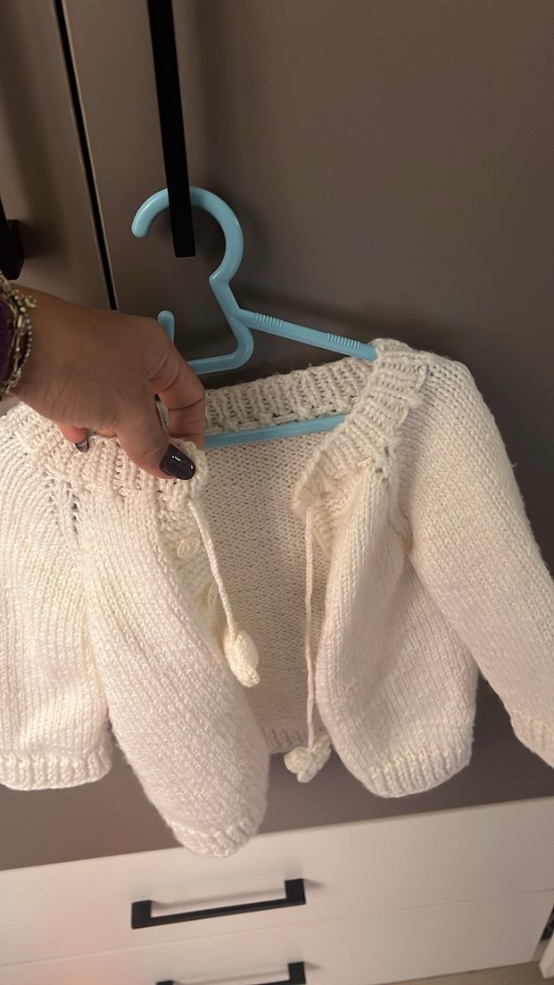 Uzun kollu, beyaz renkli ve bohem tarzda bol kesim örgü hırka. Yumuşak örme kumaştan yapılmış, desensiz sade tasarım.