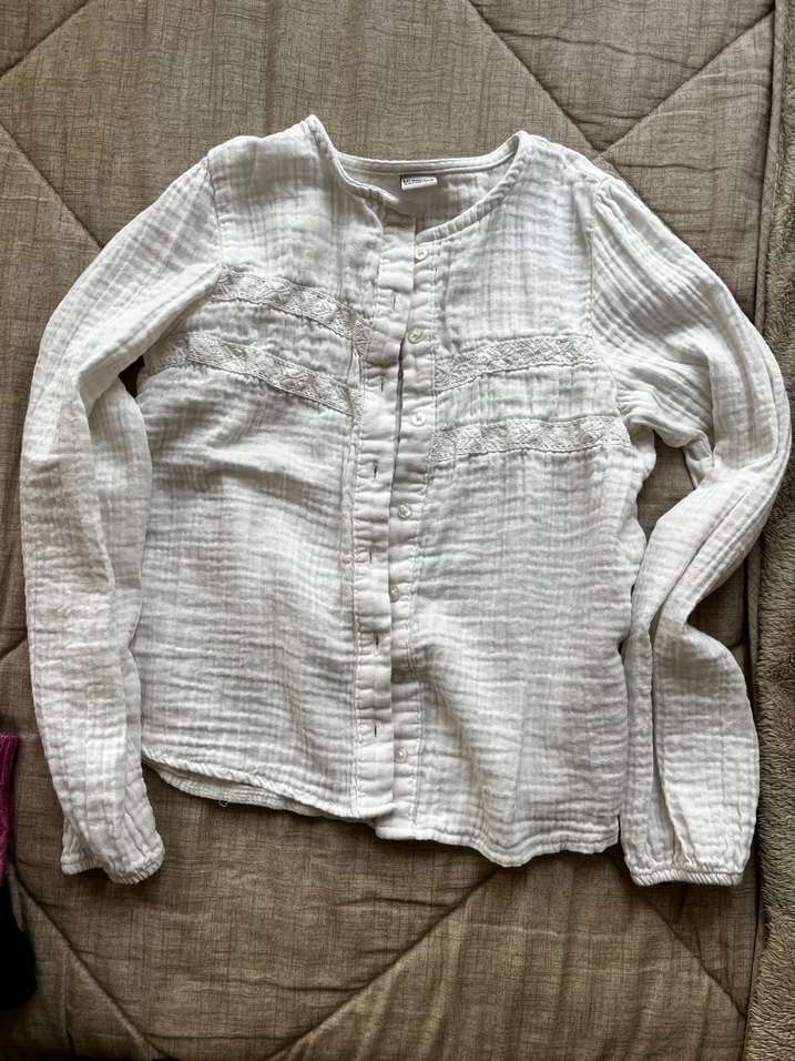 Yumuşak keten kumaştan yapılmış, bol kesim beyaz kız çocuk gömleği. Uzun kollu, yuvarlak yakalı ve düğmeli ön detaylı bohem tarzı.