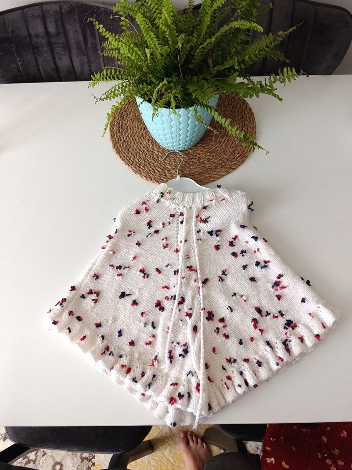 Örgü, beyaz çiçek desenli ve kolsuz kız çocuk pançosu, bol kesim bohem tarzda.