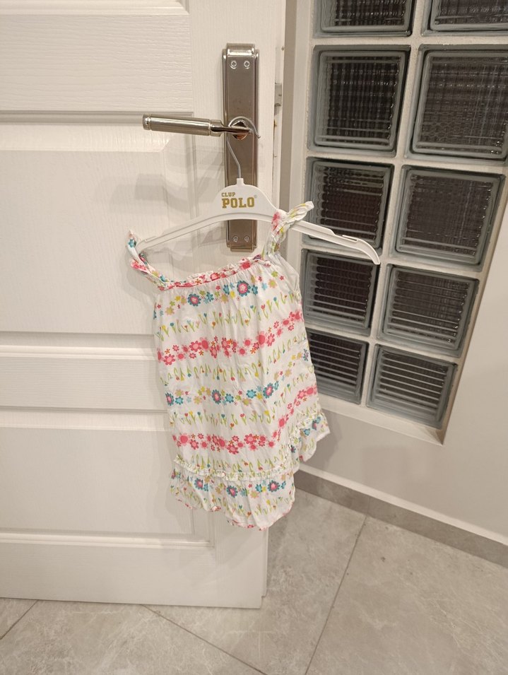 Askısız, kolsuz kız çocuk elbisesi; pastel renklerde, gevşek kesim, fırfırlı ve çiçek desenli. Pamuklu, bohem tarzda, üzerinde 'POLO' etiketi bulunur.