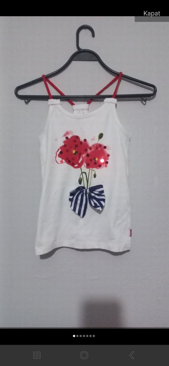 Kız çocukları için beyaz, fitted kesim, straplez, kırmızı payetli çiçek baskılı, kırmızı ince askılı, fırfırlı detaylı sentetik kumaştan atlet.