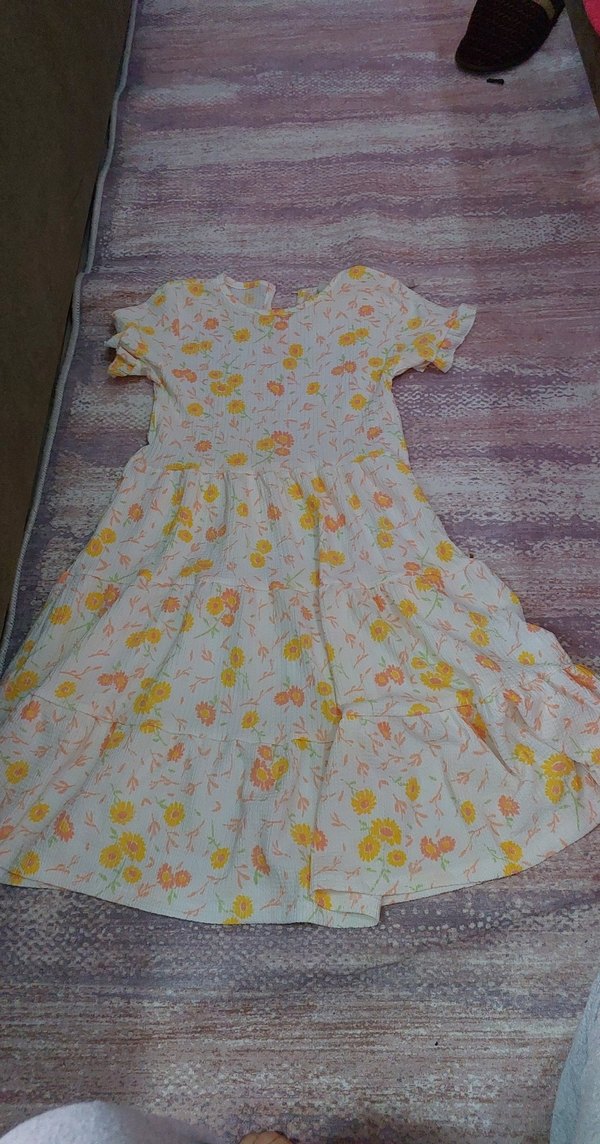 Kısa kollu, yuvarlak yaka, pastel çiçekli desenli ve fırfırlı detaylara sahip bol kesim kız çocuk elbisesi, bohem tarzda.