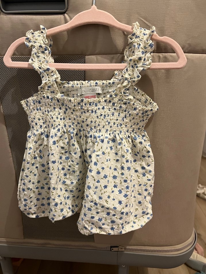 Pamuklu, kolsuz beyaz tişört , fırfırlı askılar ve bol kesim. Bohem tarzda çiçek deseni içerir.