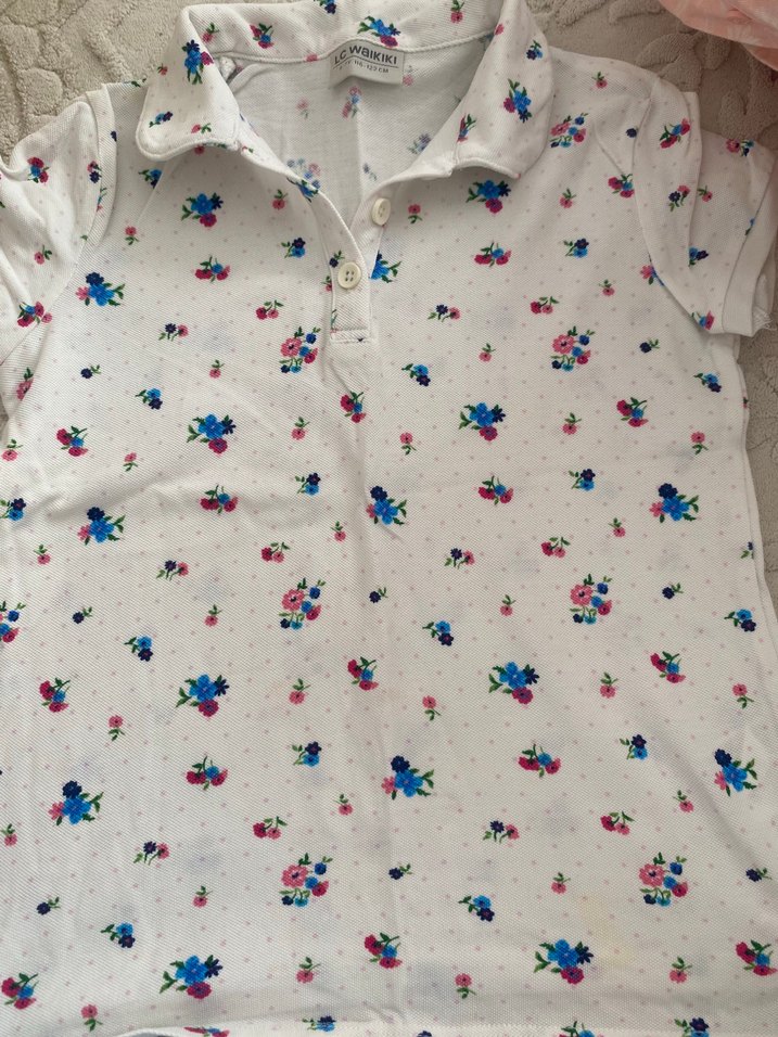 Pamuklu, beyaz zemin üzerine pastel renkli küçük çiçek desenleriyle, kısa kollu ve yakalı, düğmeli, kız çocuklarına uygun dar kesim gömlek.