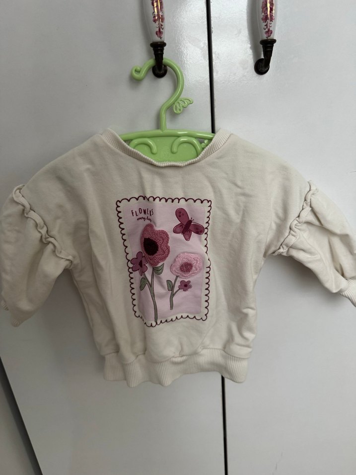 Uzun kollu, fırfırlı kız çocuk sweatshirtü. Yumuşak ve sıcak kumaştan, bol kesim. Önünde pastel çiçek ve kelebek baskısı bulunur.