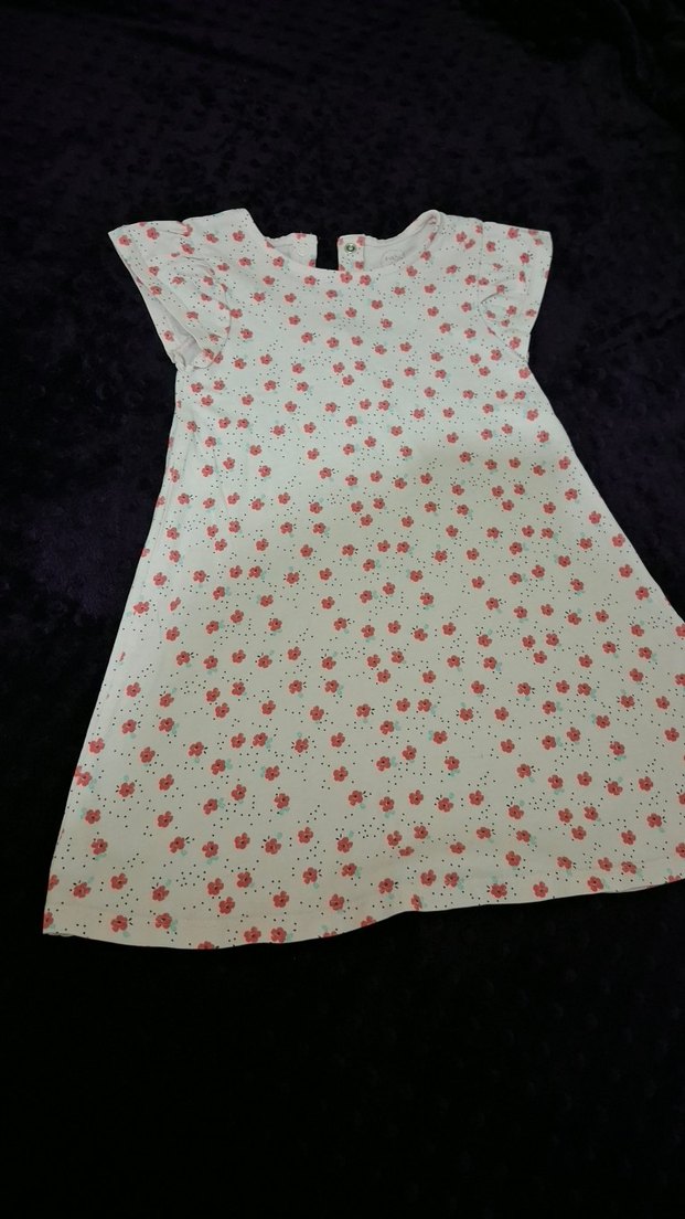 Kolsuz, V yaka ve düğmeli kız çocuk elbisesi. Pastel beyaz zemin üzerinde bohem tarzda çiçekli baskıya sahip, vücuda oturan kesim.