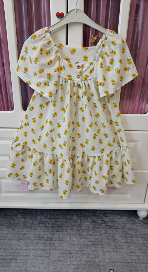 Kız çocuk elbisesi, sentetik kumaştan, bol kesim, kısa kollu ve straplez yakalıdır. Pastel beyaz zemin üzerinde çiçek desenli ve volan detaylı, bohem tarzındadır.