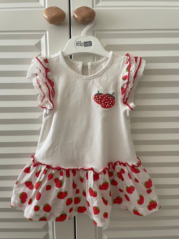 Kız Çocuk Beyaz Çilek Desenli Fırfırlı Elbise