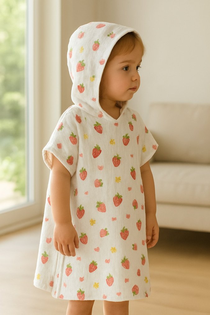 anne eliyle dikilen özellikle bebek tekstilinde kullanılan %100 organik nefes alabilen pamuklu muslin kumastan panco küçük prensesiniz denizden yada havuzdan ciktiginda direk gunese maruz kalmamasi adina hatta banyodan ciktiginda havlu niyetine bile kullanabileceginiz olmazsa olmaziniz olmaya aday bir giysi