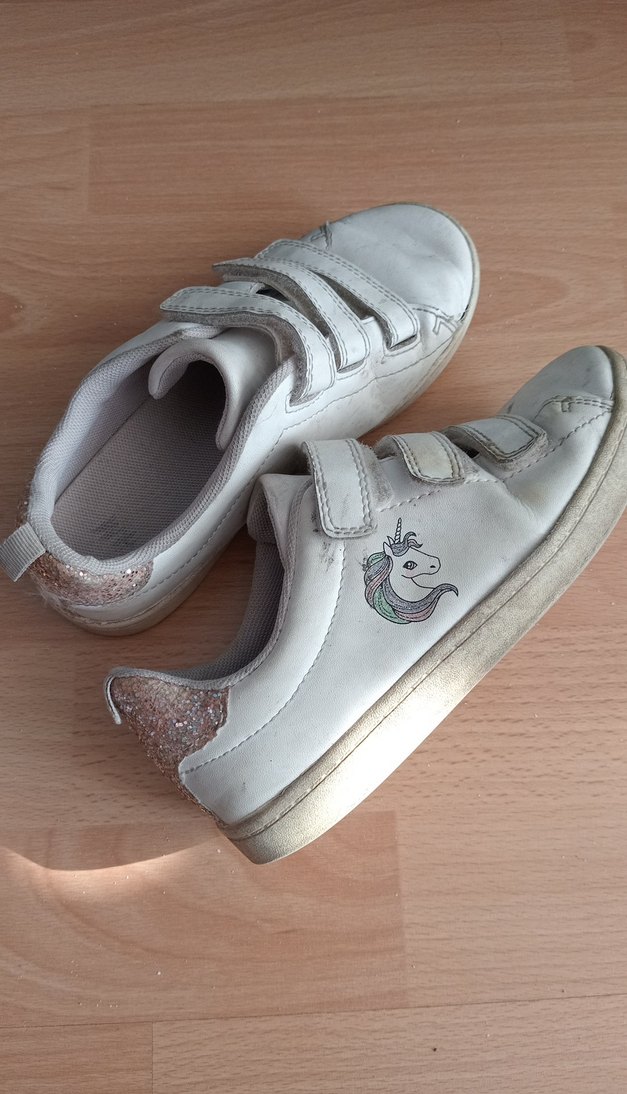Beyaz kız çocuk spor ayakkabısı, cırt cırtlı, pastel renklerde nakışlı tek boynuzlu at detayı ve kauçuk tabanlı. Parlak topuk detayıyla günlük sokak stili için uygun.