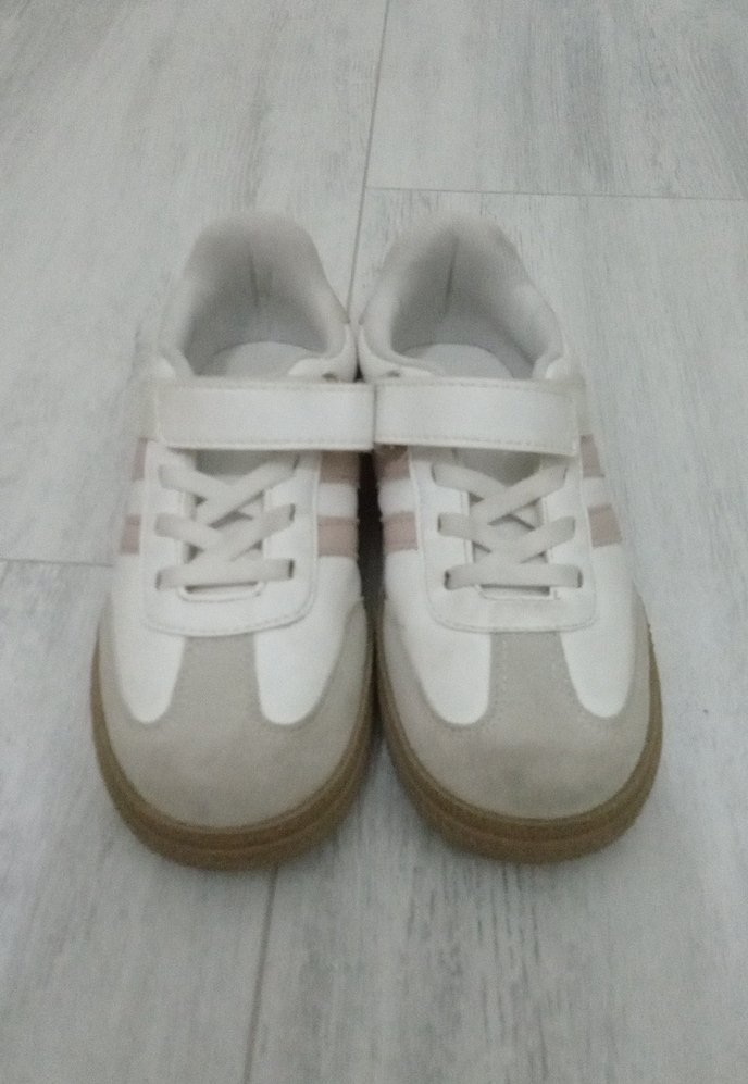 Beyaz, cırt cırtlı ve kauçuk tabanlı kız çocuk sneakers. Pastel renk detaylarıyla sokak stiline uygun, rahat ve sade tasarım.