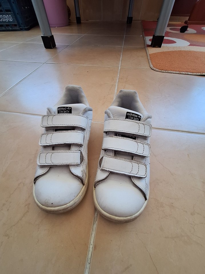 Beyaz renkli kız çocuk spor ayakkabıları, üç cırt cırtlı bant ve gri renkli kauçuk tabana sahiptir. Düz ve deseniz sade bir tarz sunar. göründüğü gibi. #kizayakkabisi#adidas#adidaskizayakkabisi