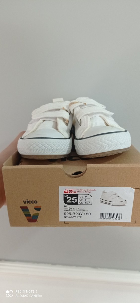 Beyaz kauçuk malzemeden, baskılı desenli ve cırt cırtlı çocuk spor ayakkabısı, sokak modasına uygun. unisex modeldir sadece 2 kez gösteride kullandı üst kısmında ufak bir leke var yıkandığında çıkacağını düşünüyorum