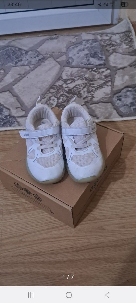 Beyaz, desensiz kız çocuk spor ayakkabısı, kolay kullanım için cırt cırtlı bantlıdır. Kauçuk tabanlı, sade sokak stili için uygundur. sol ayakkabinin cırt cirtı biraz gevsek onun haricinde sorunu yoktur