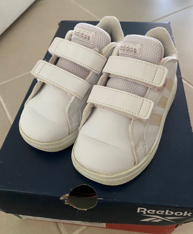 Beyaz, cırt cırtlı bantlı ve kauçuk tabanlı kız çocuk spor ayakkabısı. Pastel tonlarda, desensiz ve rahat sokak stili için uygun. Hiçbir deformesi yok.