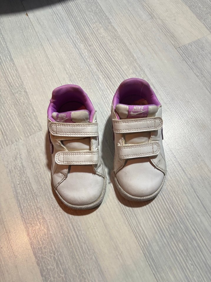 Beyaz, cırt cırtlı kız çocuk spor ayakkabısı, kauçuk tabanlı ve pastel mor iç astarlı, sade tarzda.