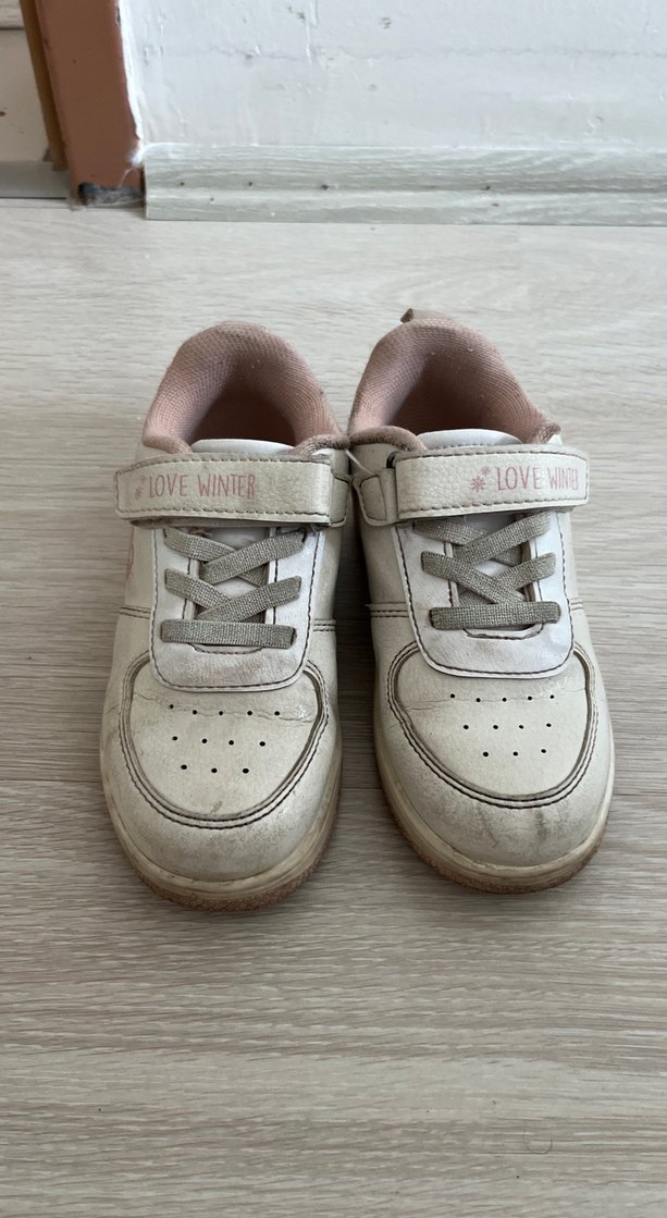 Beyaz kauçuk kız çocuk spor ayakkabısı, 'LOVE WINTER' yazılı cırt cırtlı bantlı. İç kısmı pastel tonlarda, sade ve sokak stiline uygun. Temizlenip gönderilecektir