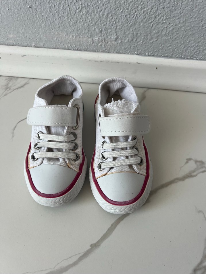 Beyaz kız çocuk spor ayakkabısı, cırt cırtlı kapanışlı ve kauçuk tabanlıdır. Kenarlarında renkli detaylar bulunur. 2 defa giyildi olmadığı için satıyorum