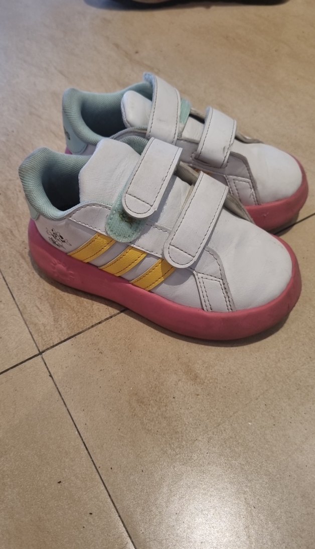 Beyaz kız çocuk spor ayakkabısı, cırtcırtlı, pembe kauçuk tabanlı ve sarı şeritli, tie-dye desenli, trend sokak stili için uygundur. 25,5 numara seçeneklerde olmadığı için 25 yaptim