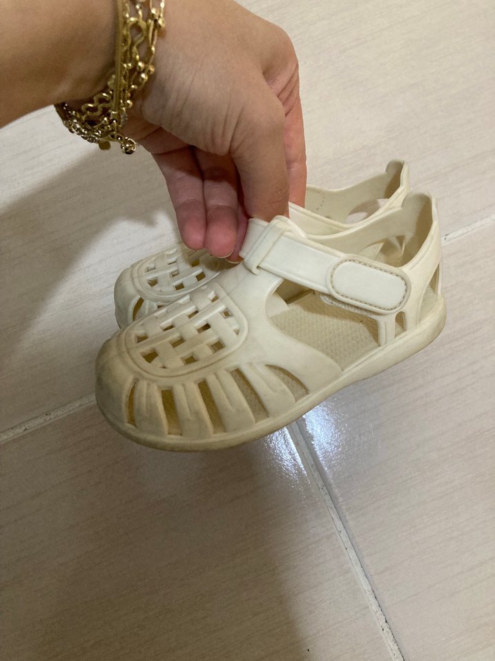 Beyaz renkli, cırtcırtlı bantlı, sade ve desensiz kız çocuk terliği, sokak stiline uygun.