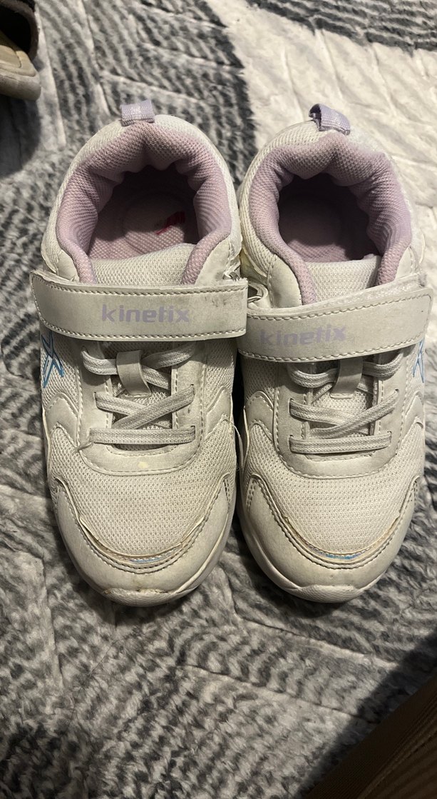 Beyaz kız çocuk spor ayakkabısı, pastel detaylı, cırt cırtlı ve kauçuk tabanlı, rahat sokak stili için uygun. Marka adı 'Kinetix' görünüyor.