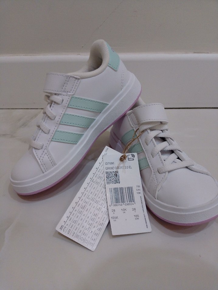 28 numara Beyaz renkli, etiketli Adidas pastel detaylı kız çocuk spor ayakkabısı. Cırtlı bant ve kauçuk tabanlı, baskılı desene sahip sokak stili ayakkabı.