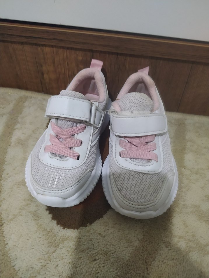 Pastel pembe detaylı beyaz kız çocuk spor ayakkabısı, kolay giyilmesi için cırtlı ve kauçuk tabanlıdır. Günlük sokak stili için uygundur.