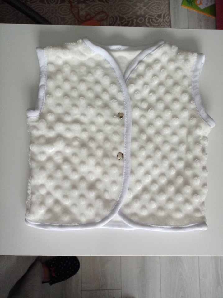 sıfır ürün. Kız çocuklar için beyaz çıtçıtlı yelek. Yumuşak dokulu kumaş ve yuvarlak yaka tasarımıyla sade ve basic görünümdedir.