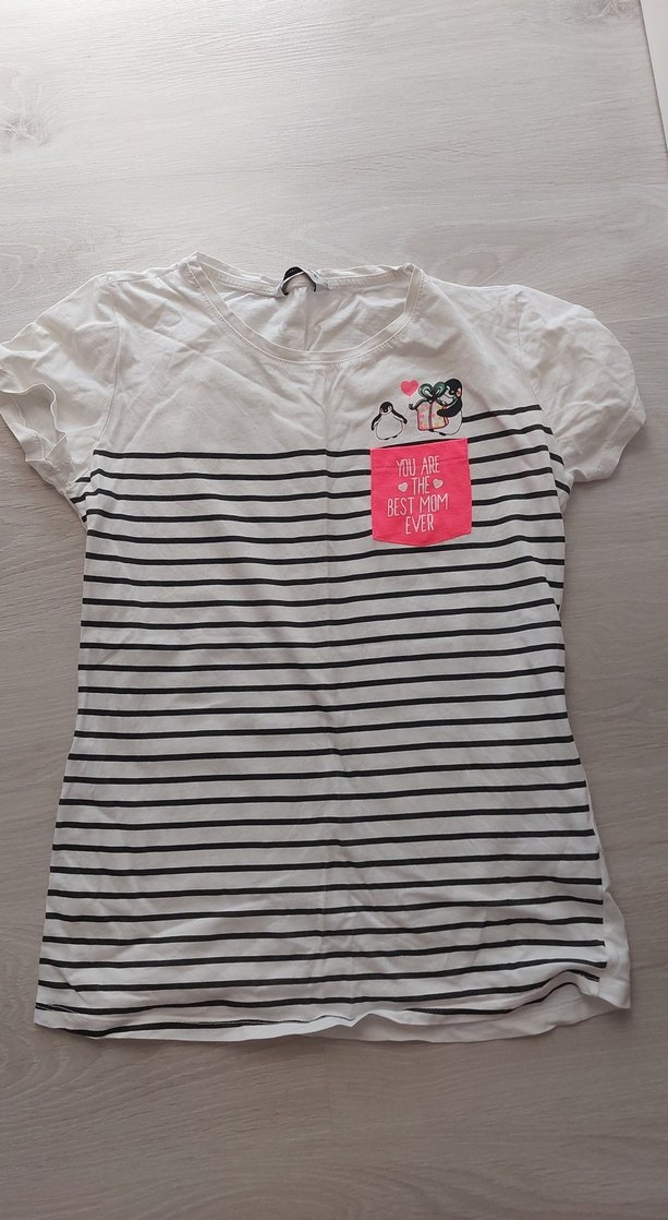 Kısa kollu, bisiklet yaka ve beyaz zemin üzerine gri çizgili, göğüs kısmında renkli baskılı tasarıma sahip kız çocuk tişörtü. Pamuklu yumuşak kumaştan üretilmiştir.