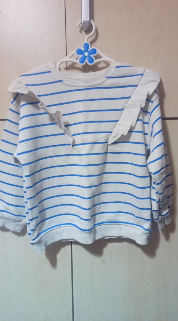 Uzun kollu, bisiklet yaka ve beyaz üzerine pastel mavi çizgili pamuklu kız çocuk sweatshirtü. Salaş kesim ve fırfır detaylarıyla şık ve rahat.