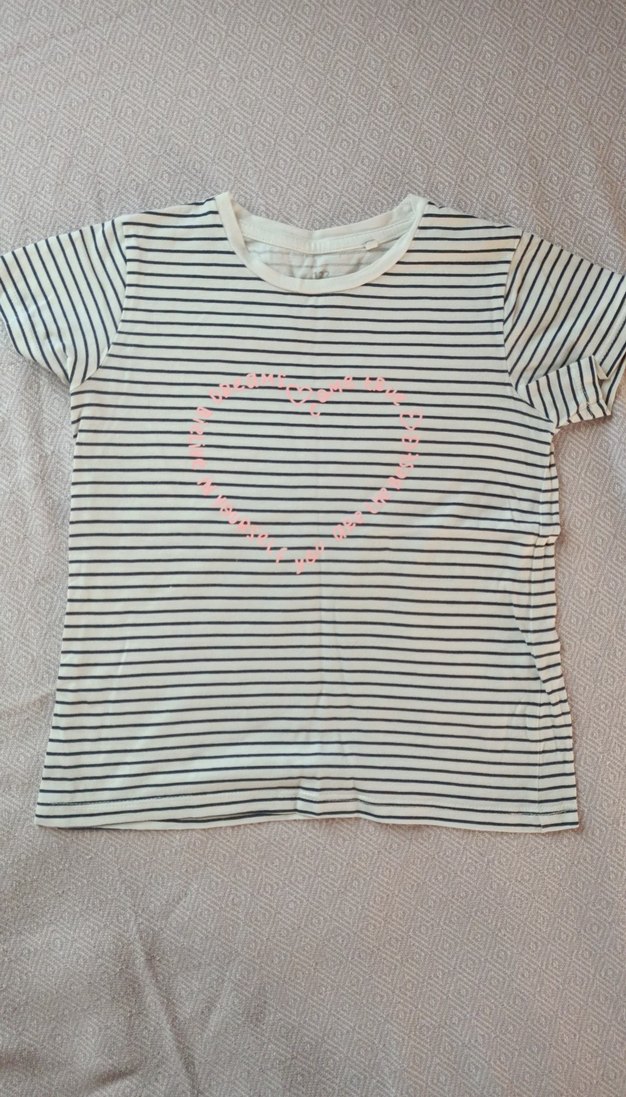 Kız çocuk tişörtü, kısa kollu ve yuvarlak yakalıdır. Pamuklu kumaştan üretilmiş, beyaz zemin üzerinde ince siyah çizgiler ve pastel pembe kalp baskısı vardır. Düğme detaylarıyla tamamlanmıştır.