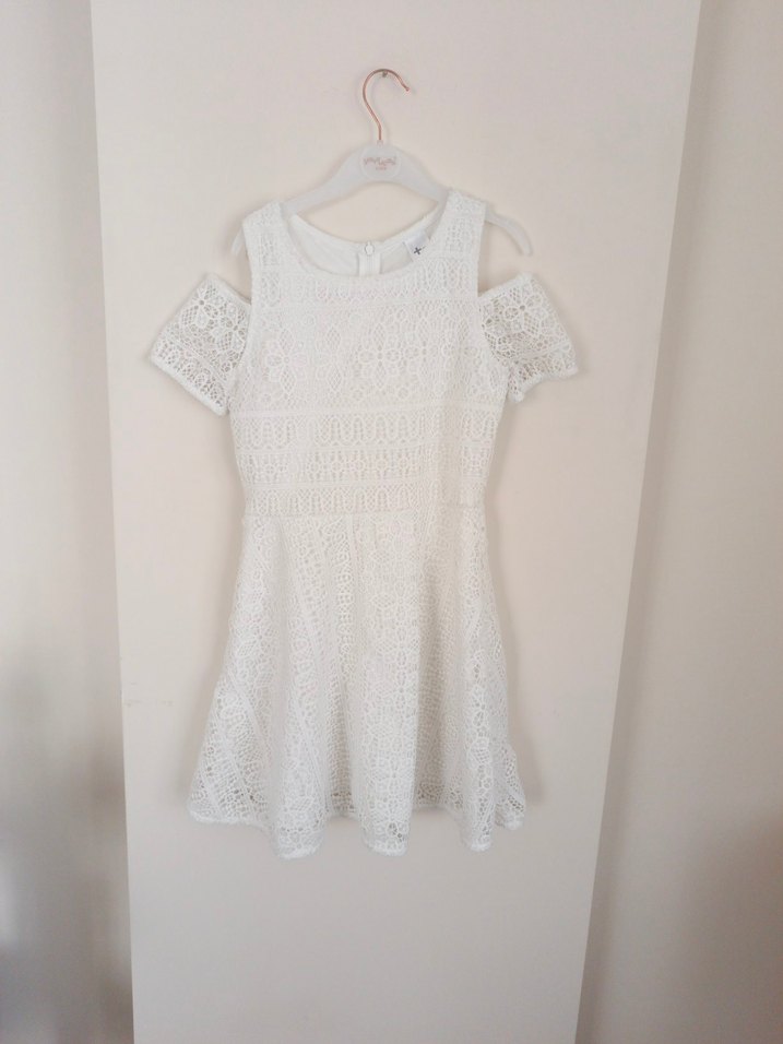 Beyaz renkli, kısa dantel kollu, işlemeli desenli, straplez yakalı ve vücuda oturan bohem tarzda kız çocuk elbisesi.