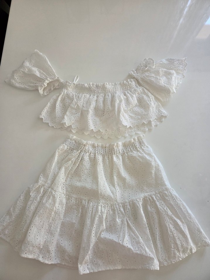 Pamuklu kumaştan, dantel ve işlemeli detaylara sahip beyaz bohem tarzda kız çocuk elbisesi. Askılı ve straplez kesimiyle rahat bir kullanım sunar.