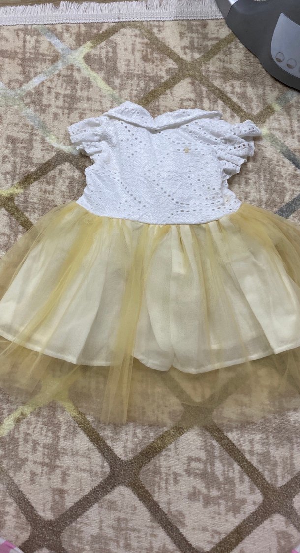 Fitted kesim, straplez yaka, beyaz işlemeli dantel üst ve açık sarı tül etekten oluşan bohem tarzda kız çocuk elbisesi.