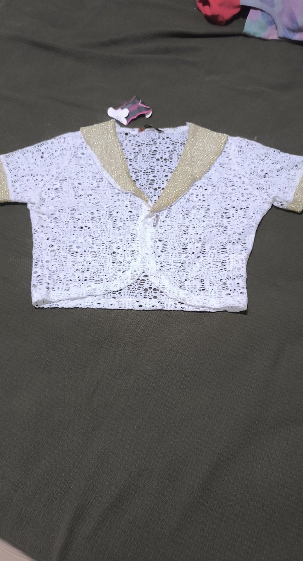 Kısa kollu, V yakalı, işlemeli dantel detaylı beyaz örme bolero, bohem tarzı için uygundur.