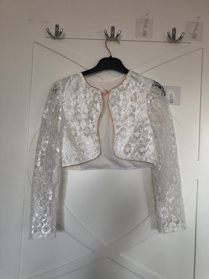 Kız çocuklar için beyaz dantelli, işlemeli ve straplez yakalı, uzun kollu, bohem tarzda ince kesim bolero. Yumuşak sentetik kumaştan yapılmıştır.