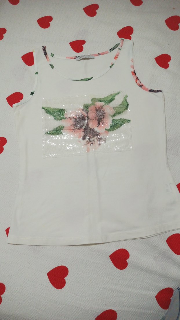 Beyaz, dantel ve pul işlemeli çiçek baskılı, askısız yakalı, ince kesim kız çocuk atlet. Yumuşak sentetik kumaştan yapılmıştır.