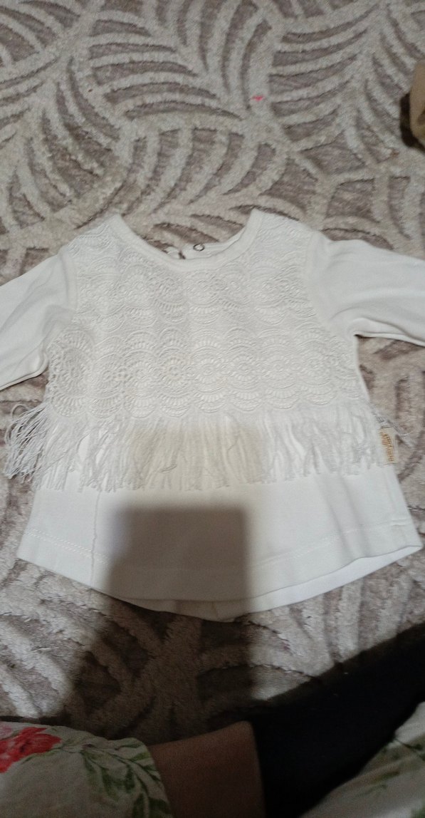 Kız çocuk için uzun kollu, yuvarlak yakalı, bol kesim beyaz bluz. Yumuşak örme kumaştan, ön kısmı işlemeli dantel ve püsküllü, bohem tarzda.
