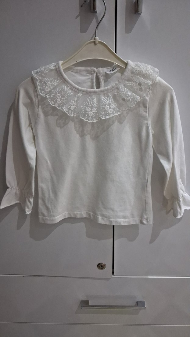 Pamuk kumaştan, yuvarlak yakalı ve uzun kollu kız çocuk beyaz bluz. Dantel işlemeli detaylarıyla modern klasik tarzda, bol kesim.