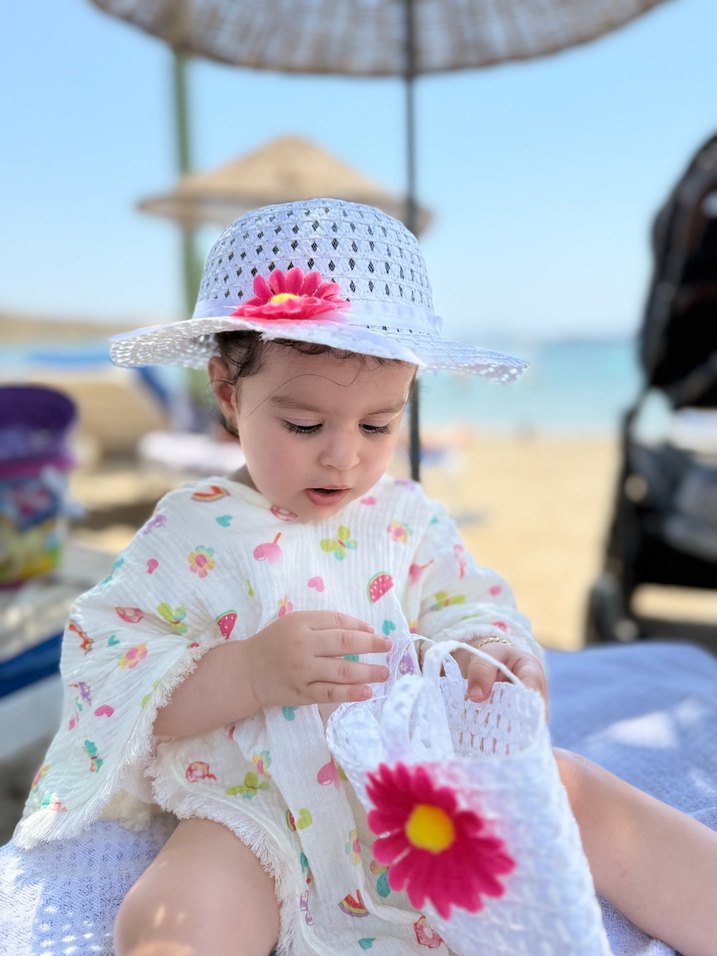 Beyaz renkli, dantel detaylı, straplez yakalı ve kısa kollu kız çocuk ponchosu. Gevşek kesimi ve açık tonlu batik desenleriyle bohem tarzını yansıtıyor. Çanta şapka takım