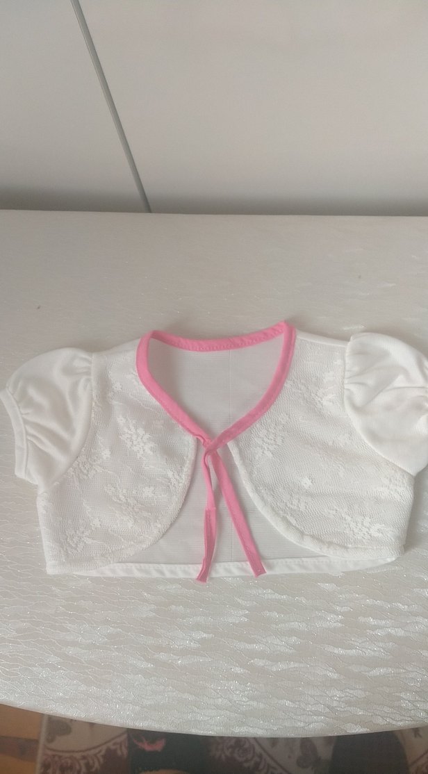 Kız çocukları için beyaz, dantel ve nakışlı triko bolero. Kısa kollu, V yakalı, pastel pembe bağcıklı ve dar kesim.