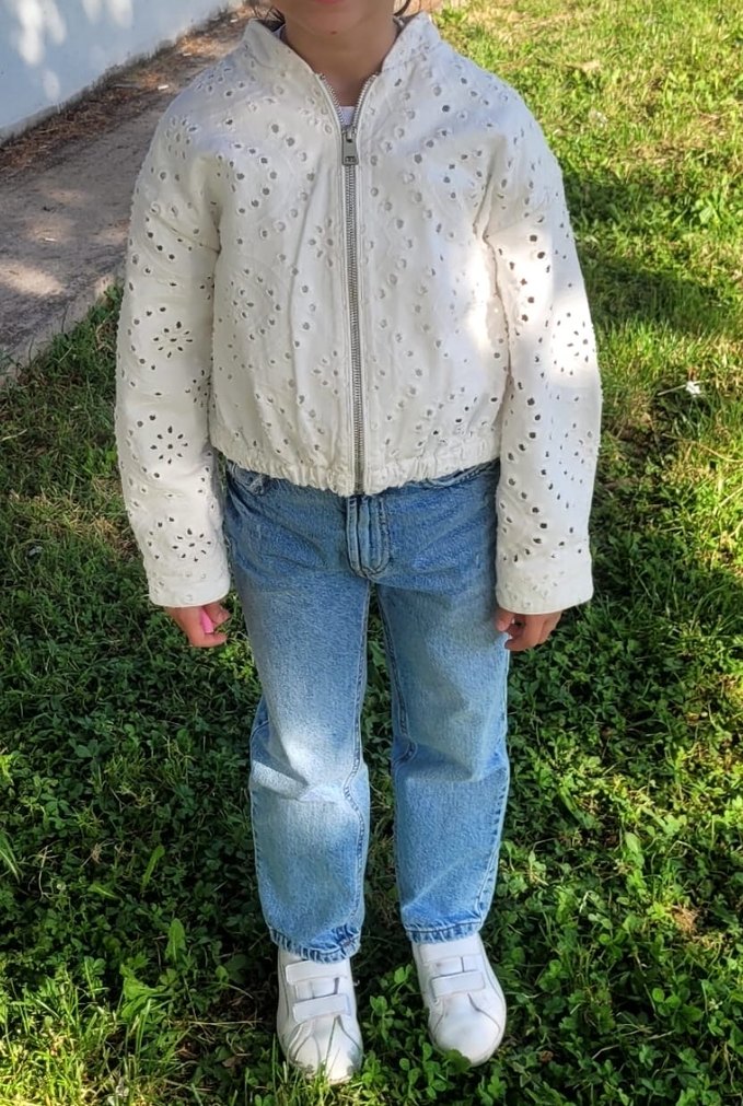 Kız çocuklar için beyaz renkli, dantel detaylı, notched lapel yakalı, bol kesim denim ceket.