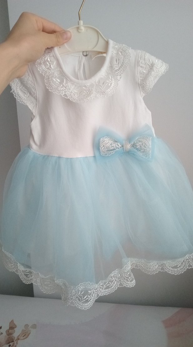 Pamuklu kumaştan yapılmış, kısa kollu, yuvarlak yakalı, dantel ve nakış detaylı, pastel mavi tüllü etekli, dar kesim kız çocuk elbisesi.